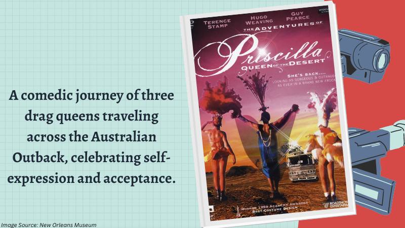 The Adventures of Priscilla, Queen of the Desert is a fabulous Australian comedy that follows the hilarious and heartwarming journey of two drag queens and a transgender woman as they embark on a road trip across the Australian outback in a colorful bus named Priscilla.