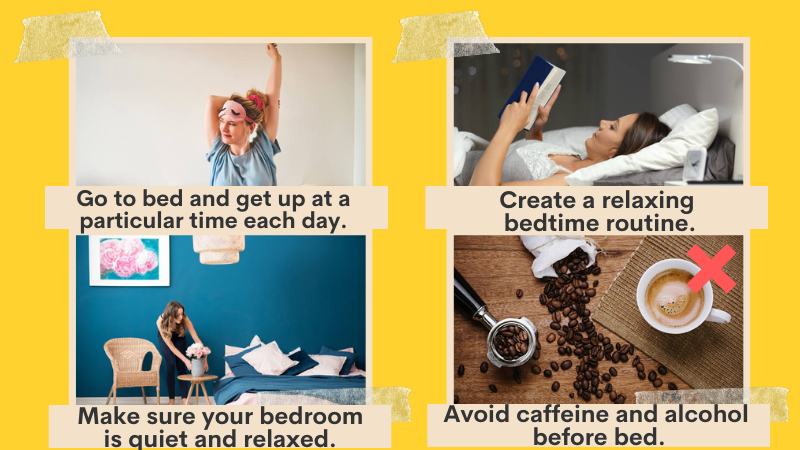 1) Go to bed and get up at a particular time each day, even on weekends. This will help regulate your body’s natural sleep rhythm.