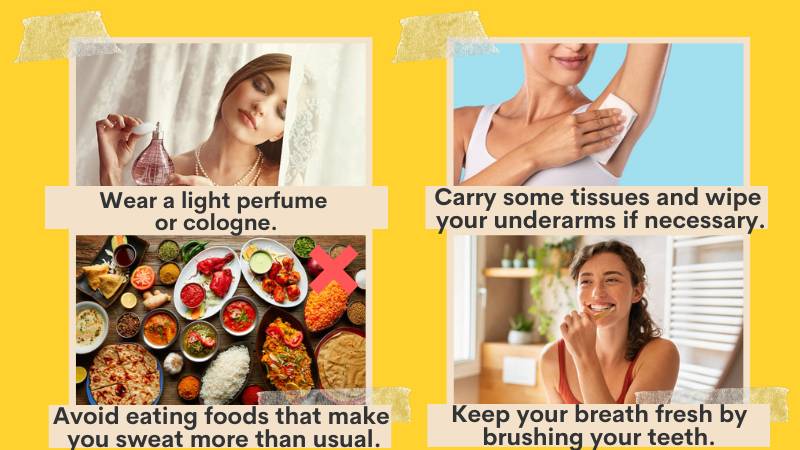 Sometimes our bodies also produce more sweat when we are nervous. In this case, try carrying some tissues with you and discretely wiping your underarms if necessary. If possible, avoid eating foods that make you sweat more than usual before going out (for example, spicy food).