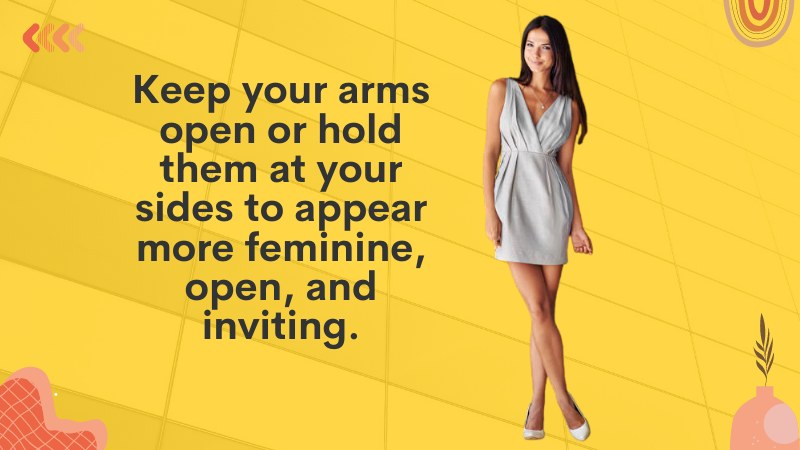 When you cross your arms, you look closed off and unapproachable. Instead, keep your arms open or hold them at your sides to appear more feminine, open, and inviting.