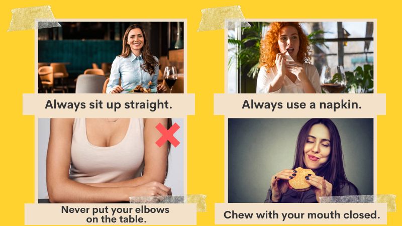 Third, never put your elbows on the table. This isn’t polite.