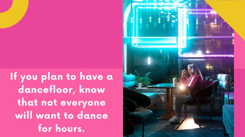 If you plan to have a dancefloor, know that not everyone will want to dance for hours. Be sure to accommodate everyone with their preferred space!