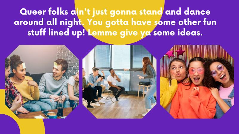 Queer folks ain’t just gonna stand and dance around all night. You gotta have some other fun stuff lined up! Lemme give ya some ideas.