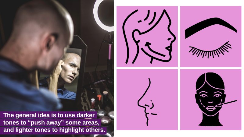 Now, I need to teach you how to apply your makeup the right way. What you want to do is to conceal your masculine features, while emulating feminine ones. It may include your jawline, eyebrows and nose, with further applications on your cheeks, eyes, chin and forehead. The general idea is to use darker tones to “push away” some areas, and lighter tones to highlight others, such as seen in the image below. If you wish, you can use this same technique to create “natural” cleavage.