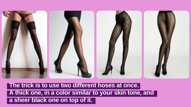 To enhance such an effect, hip pads are recommended. They will make your hips and butt look bigger, and your waist even thinner. Of course, I recommend getting some Roanyer silicone pads, which you can fit inside your hosiery. But some other options include padded panties and DIY foam pads. These options will make your legs curvier than ever, but you can also make them smooth and sexy. To do so, you’ll need a few pantyhose options. A thick black one is useful for almost every occasion, but if you want a more “revealing” outfit, you can adapt it. The trick is to use two different hoses at once. A thick one, in a color similar to your skin tone, and a sheer black one on top. It will look like some of your skin is still visible through the black hose, and your legs are smooth and hairless.