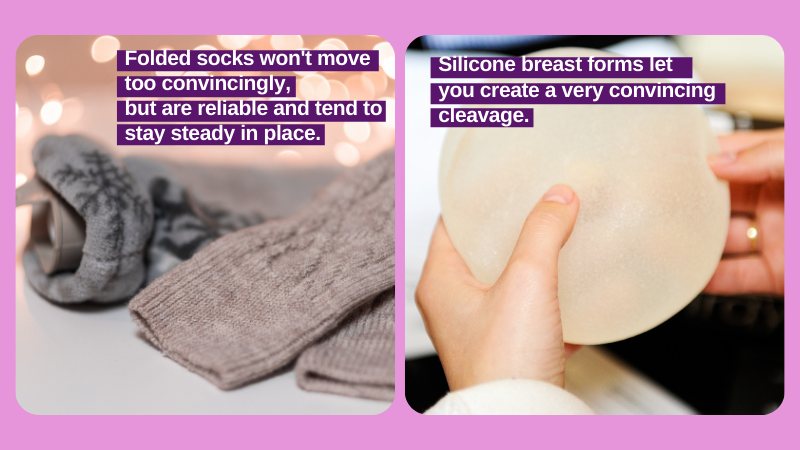Each “stuffing” has its own advantage, but folded socks are most recommended. They won’t move too convincingly but are reliable and tend to stay steady in place. For a more realistic approach, you may try silicone breast forms. They let you create a very convincing cleavage despite being more expensive. My tip is to try as many methods as possible for each situation until you find out which suits your needs better.