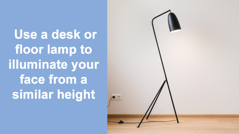 The best option is to use a desk or floor lamp to illuminate your face from a similar height. There are lots of choices for these; especially now that video calls and remote work has become more prevalent.