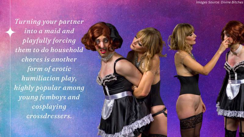 Turning your partner into a maid and playfully forcing them to do household chores is another form of erotic humiliation play, highly popular among young femboys and cosplaying crossdressers.