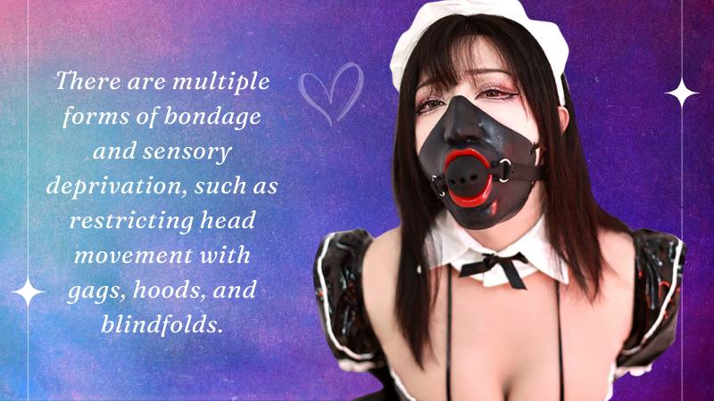 There are multiple forms of bondage and sensory deprivation, such as restricting head movement with gags, hoods, and blindfolds.