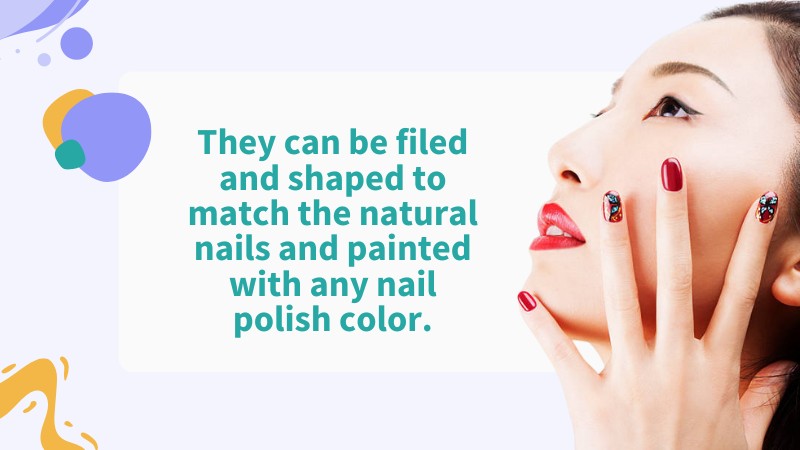 They can be filed and shaped to match the natural nails and painted with any nail polish color. However, it’s important to note that a professional nail technician should apply and maintain acrylic nails, as improper application or removal can damage the natural nails. Additionally, acrylic nails require regular maintenance, such as fill-ins every 2-3 weeks, to keep them looking their best.