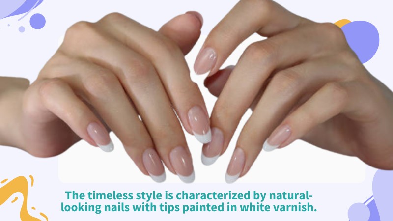 A French manicure is a classic and elegant nail look suitable for various occasions. The timeless style is characterized by natural-looking nails with tips painted in white varnish. This creates the illusion of longer fingers, which is a nice bonus. French manicures are also suitable for corporate environments, making them a versatile and office-friendly choice. This look is achieved by painting the nails with a neutral or pale pink polish, then applying a white polish to the tips of the nails. This creates a clean, polished look that can be achieved with minimal effort.