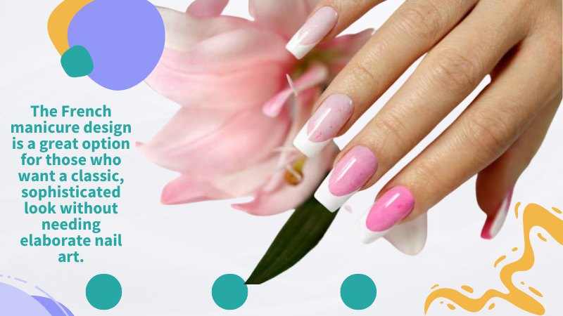 The French manicure design is a great option for those who want a classic, sophisticated look without needing elaborate nail art. It can be done with different shades of pink or neutral colors to suit your preference. It can be further embellished with glitter or other nail art accessories. The design can be done on natural nails or acrylic nails, and it’s a design that can be done by yourself at home or by a professional nail technician. It’s important to note that a French manicure requires a steady hand and a steady touch for application. Still, anyone can achieve the look with a little practice and patience.
