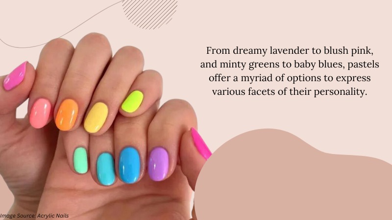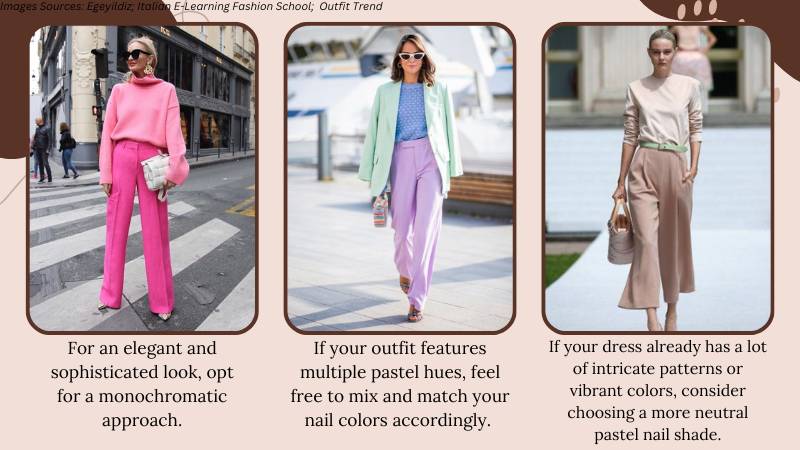Mix and Match: If your outfit features multiple pastel hues, feel free to mix and match your nail colors accordingly. Choose a different pastel shade for each nail or alternate between two complementary colors. This whimsical and fun approach adds a touch of playfulness to your look.