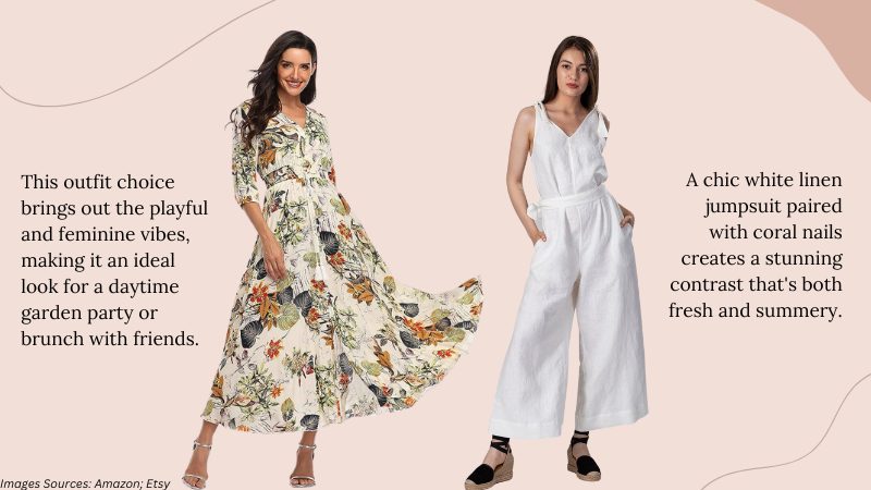 White Linen Jumpsuit: A chic white linen jumpsuit paired with coral nails creates a stunning contrast that’s both fresh and summery.
