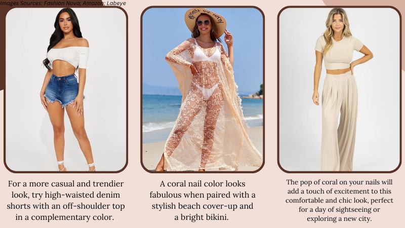 A coral nail color looks fabulous when paired with a stylish beach cover-up and a bright bikini.