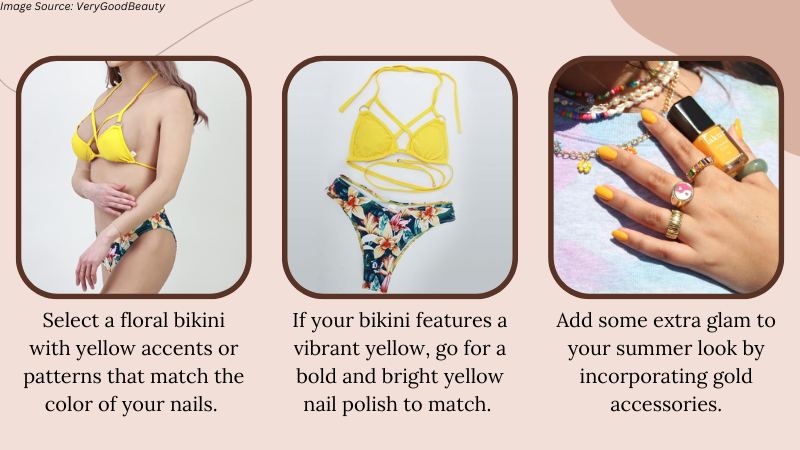 Coordinate the Shades of Yellow: If your bikini has a different shade of yellow than your nail color, try to coordinate the two hues to complement each other.