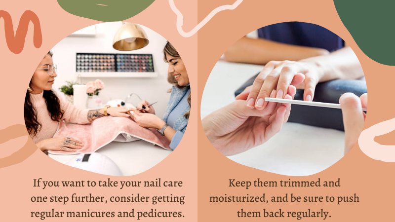 Your cuticles play an important role in the health of your nails, so it’s important to take care of them as well. Keep them trimmed and moisturized, and be sure to push them back regularly. If you find that your cuticles are especially dry or damaged, consider using cuticle oil or cream to help nourish and repair them.