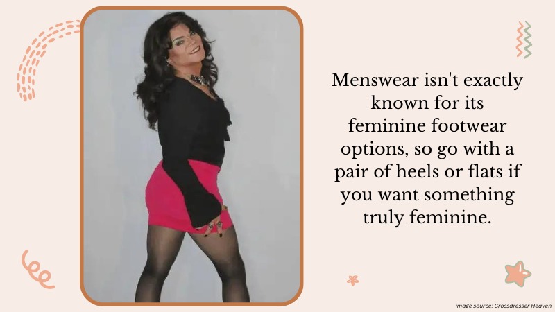 Next, stick with the classics when it comes to shoes. Menswear isn’t exactly known for its feminine footwear options, so wear a pair of heels or flats if you want something truly feminine. You can also try low heels—just keep them simple! If all else fails, try wedges if you want something more casual than heels but still want an elegant look.