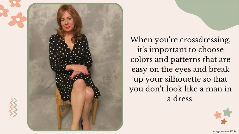 There is a time and place for that kind of boldness—and it’s not when you’re trying to pass as ladylike. When you’re crossdressing, it’s important to choose colors and patterns that are easy on the eyes and break up your silhouette so that you don’t look like a man in a dress.