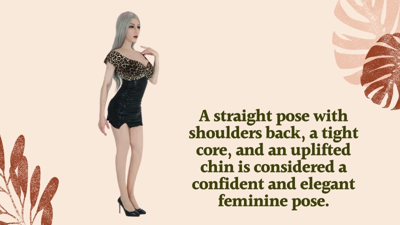 A straight pose with shoulders back, a tight core, and an uplifted chin is considered a confident and elegant feminine pose.