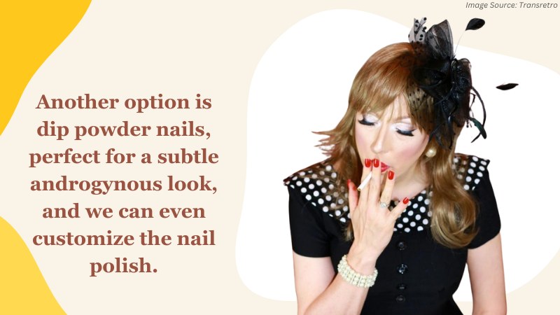 Another option is dip powder nails, perfect for a subtle androgynous look, and we can even customize the nail polish.