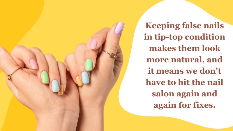 Keeping false nails in tip-top condition makes them look more natural, and it means we don’t have to hit the nail salon again and again for fixes.