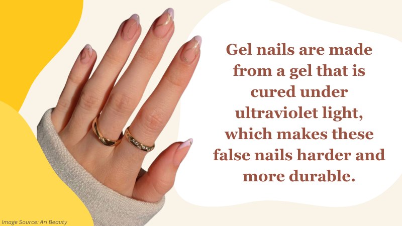 Gel nails are made from a gel that is cured under ultraviolet light, which makes these false nails harder and more durable.