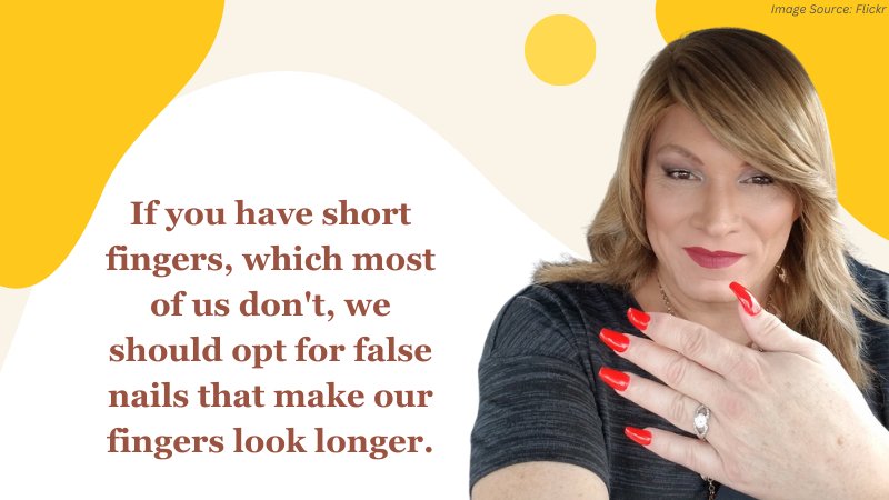 If you have short fingers, which most of us don’t, we should opt for false nails that make our fingers look longer.