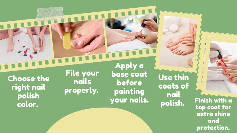 - Apply a base coat before painting your nails. This will help the polish last longer and prevent it from chipping.
