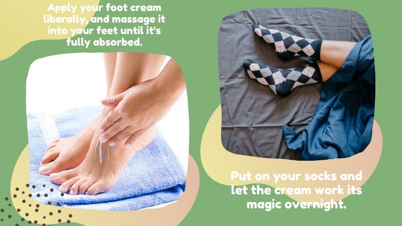 Apply your foot cream liberally, and massage it into your feet until it’s fully absorbed. Then put on your socks and let the cream work its magic overnight. In the morning, you’ll wake up to softer, more beautiful feet.