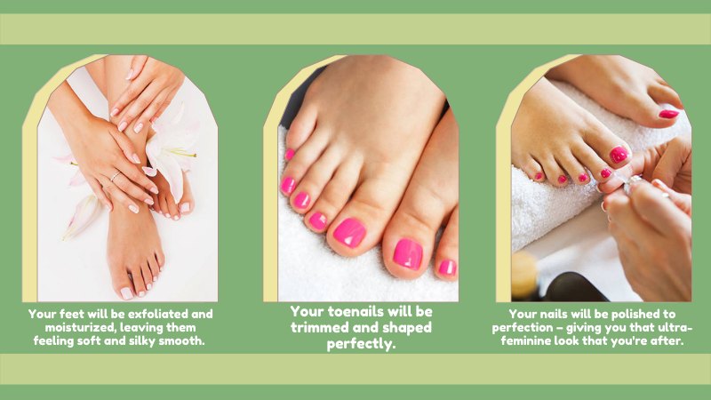 First, your feet will be exfoliated and moisturized, leaving them feeling soft and silky smooth. Secondly, your toenails will be trimmed and shaped perfectly. Thirdly, your nails will be polished to perfection – giving you that ultra-feminine look that you’re after.