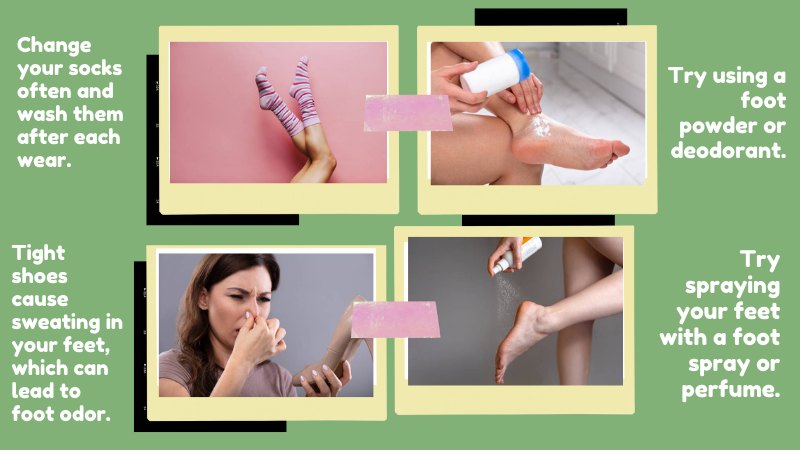 Finally, try spraying your feet with a foot spray or perfume. This will help cover up any odors that may be lingering on your feet.