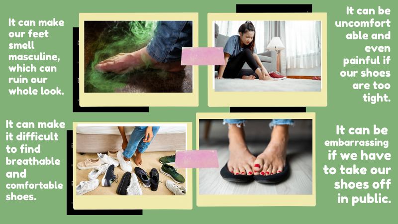 First, it can make our feet smell masculine, which can ruin our whole look. Second, it can be uncomfortable and even painful if our shoes are too tight. Third, it can make it difficult to find breathable and comfortable shoes. And fourth, it can be embarrassing if we have to take our shoes off in public.