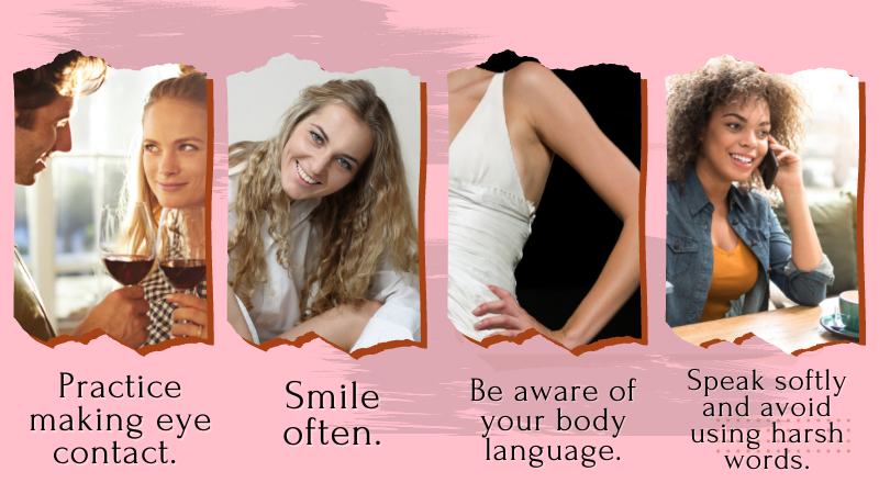 - Practice making eye contact. Making eye contact is important in all social interactions, but it’s especially important when you’re trying to come across as more feminine.