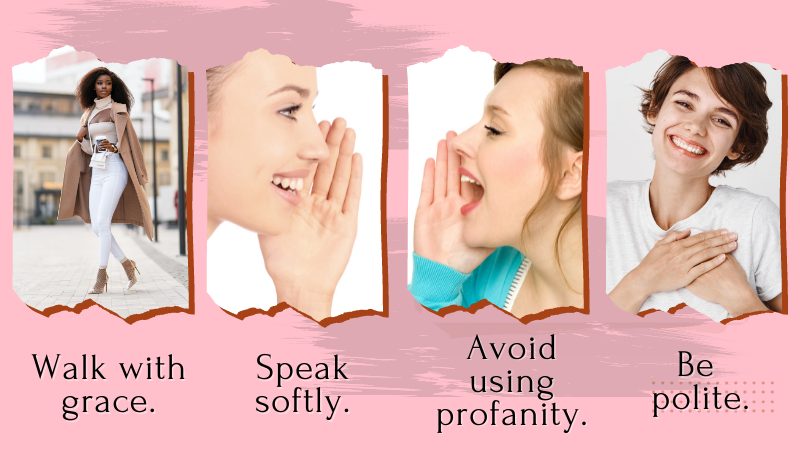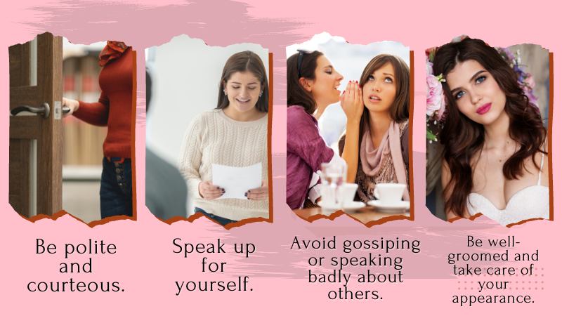 - Be polite. Another important aspect of being a lady is always to be polite. This means using please and thank you when appropriate and avoiding swearing or making crude jokes.