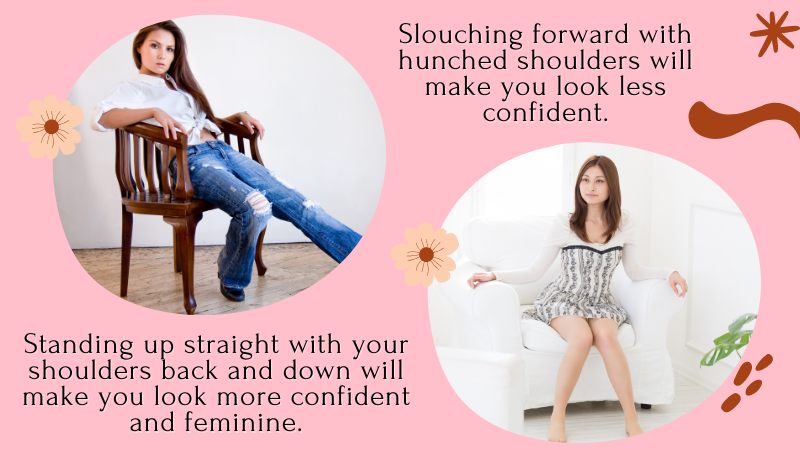 - Pay attention to your posture. Good posture is important for individuals who want to look and feel more feminine. Stand up straight and avoid hunched shoulders. When sitting, keep your back straight and don’t slouch.