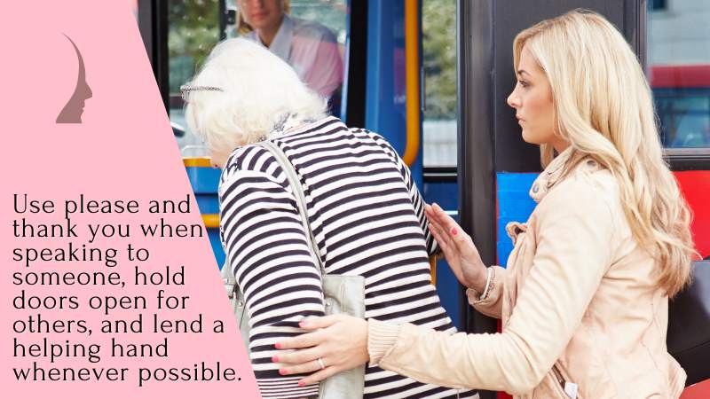 This means using please and thank you when speaking to someone, holding doors open for others, and lending a helping hand whenever possible.