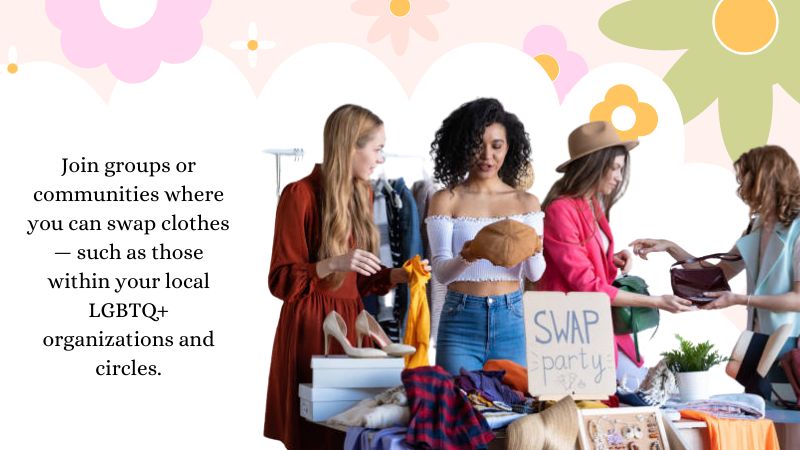 • Join groups or communities where you can swap clothes — such as those within your local LGBTQ+ organizations and circles. If you find no obvious queer groups, connect to those who celebrate Pride Month. I’m sure they can give you a tip or two on legit queer communities you can join. They can even vet for you!