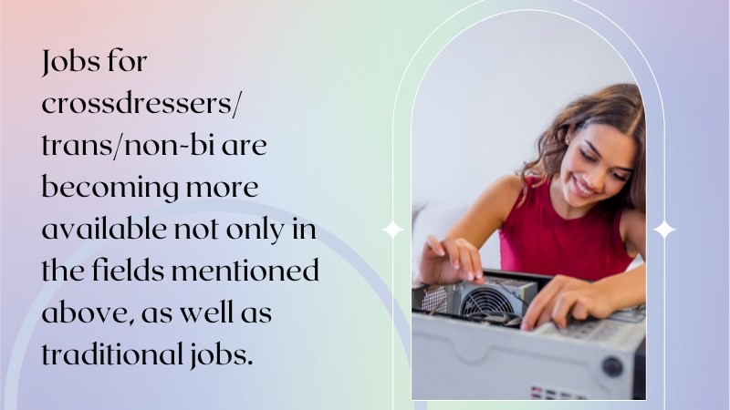 As you can see, there are a lot of jobs, and even more each day, that allow you to live and work as you wish. Thanks to technology, it has become easier to work from your home for someone on the other side of the world. And the change of paradigm it’s becoming clearer everyday. Not only that, but as we are growing as a more tolerant society, jobs for crossdressers/trans/non-bi are becoming more available not only in the fields mentioned above, as well as traditional jobs are being less reticent to contract people like us.