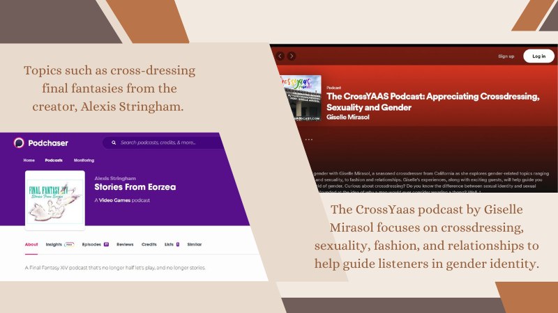 The CrossYaas podcast by Giselle Mirasol focuses on cross-dressing, sexuality, fashion, and relationships to help guide listeners in gender identity.