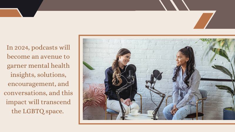 In 2024, podcasts will become an avenue to garner mental health insights, solutions, encouragement, and conversations, and this impact will transcend the LGBTQ space.