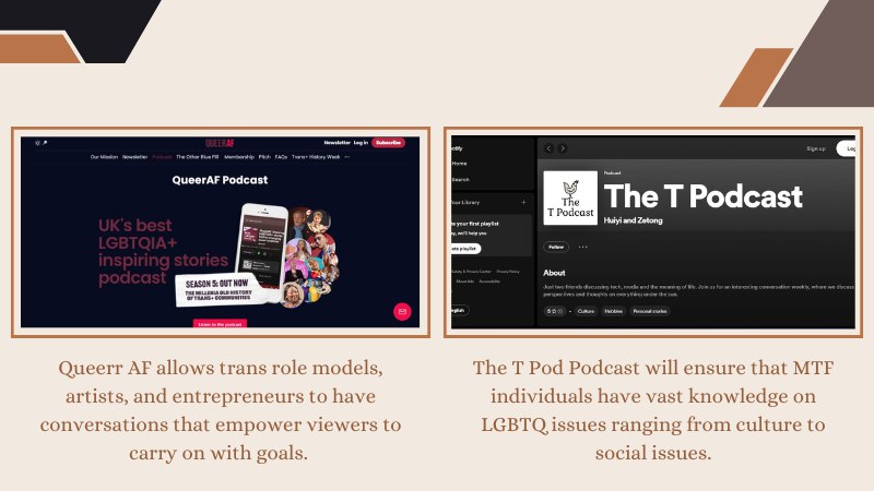 Podcasts encourage MTF and Trans viewers to be open and share their experiences, allowing them to hear more Trans voices beyond the LGBTQ space.