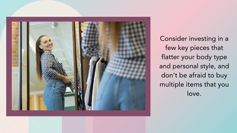 Consider investing in a few key pieces that flatter your body type and personal style, and don’t be afraid to buy multiple items that you love.