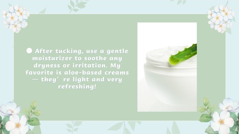 ● Moisturize: After tucking, use a gentle moisturizer to soothe any dryness or irritation. My favorite is aloe-based creams — they’re light and very refreshing!