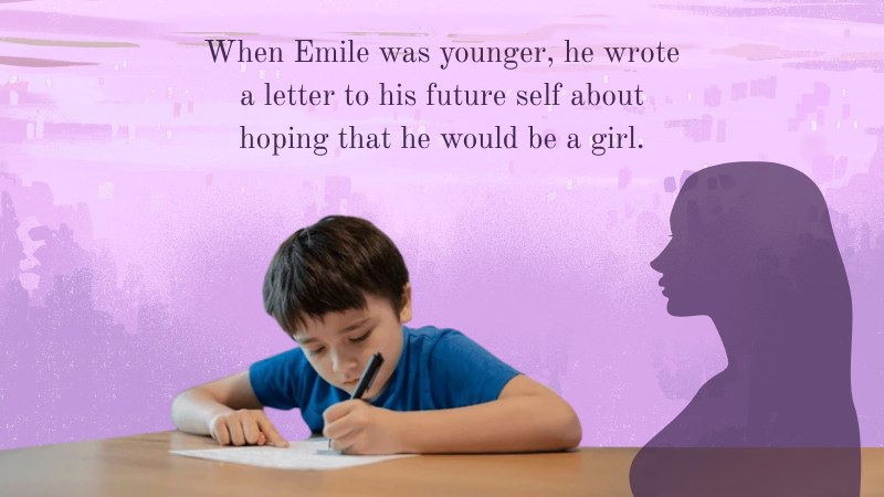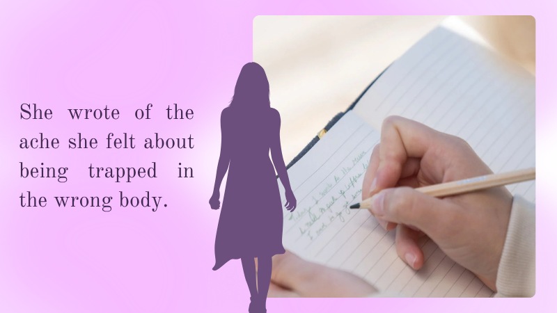 As he wrote about the words he-no, she-had thought a million times over. She wrote of the ache she felt about being trapped in the wrong body. Her yearning to be free and be herself. She wrote of her fear of rejection. She wrote about what her classmates said behind her back, what her own family whispered.