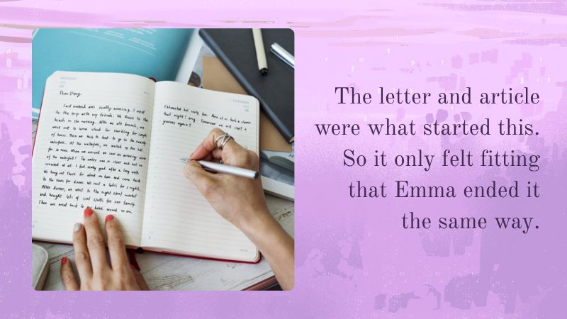 The letter and article were what started this. So it only felt fitting that Emma ended it the same way. She sat down at her computer. Her mind was ablaze with the same feelings as she had had back then. She typed: