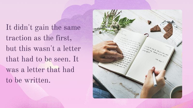 The next day, they published the letter, anonymously, of course. The town was ablaze with discussion. It resonated with thousands. It had shaken up the small town, had. All by the ghost of a girl who had never been. No one was more shaken up than the girl herself.