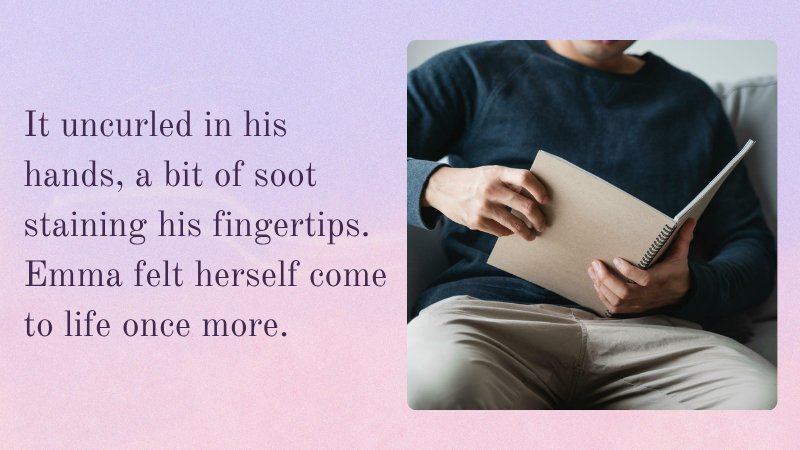 He tried to clear his throat, but the lump wouldn’t leave. Mindy handed the letter over to him. It uncurled in his hands, a bit of soot staining his fingertips. Emma felt herself come to life once more. The dam had broken. Her heart remained unchanged. She was Emma.