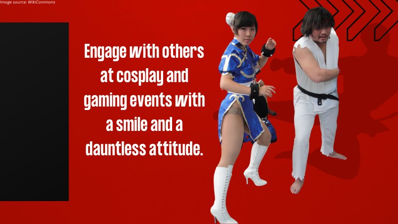 Engage with others at cosplay and gaming events with a smile and a dauntless attitude. Your energy will be contagious. Attendees will not just be drawn to your portrayal of Chun Li. They will be drawn to you.