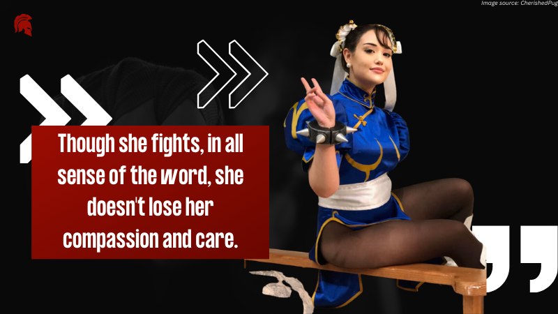 Though she fights, in all sense of the word, she doesn’t lose her compassion and care. This duality makes her fascinating and relatable. When cosplaying as Chun Li, don’t just focus on her strength. Highlight her soft side as well.